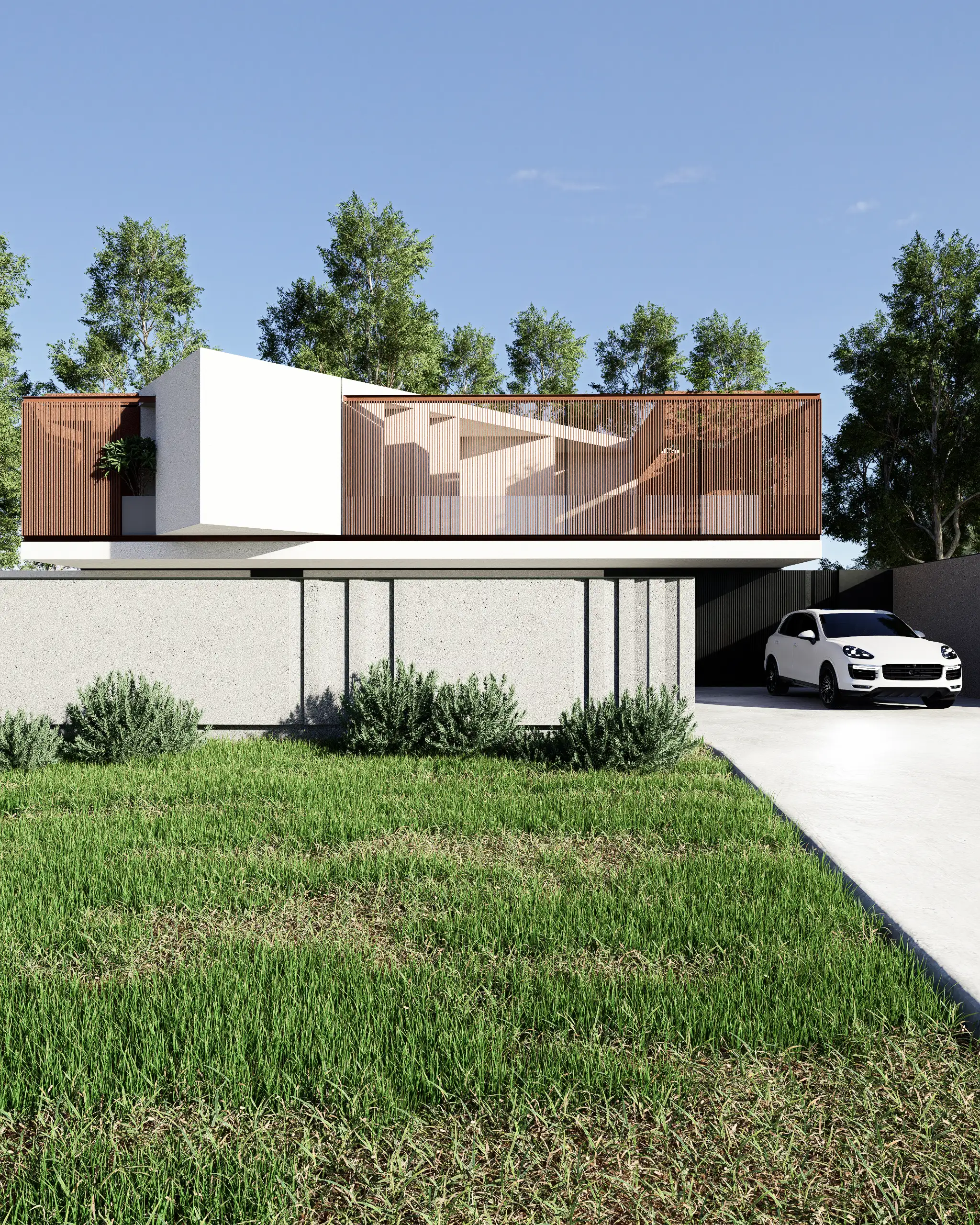 C+C House showcases a modern architectural space that combines minimalist design with natural elements. In the foreground, an irregular stone pathway is set on lush green grass, leading towards the building entrance. Two aged, dried trees on either side of the path add a sense of nature and authenticity to the space. The side walls are covered with vertical wooden slats, accompanied by soft lighting at the bottom, creating a warm and inviting atmosphere. In the central part of the image, a seating area with a modern and simple arrangement is visible, featuring minimalistic furniture and ceiling lights that enhance the ambiance. In the background, the building façade is designed with white perforated panels that incorporate operable windows. These panels not only add to the aesthetic appeal but also contribute to ventilation and light control. The combination of materials such as wood, metal, and glass, along with the surrounding greenery, creates a harmonious and balanced architectural experience that emphasizes sustainable design and a connection with nature.