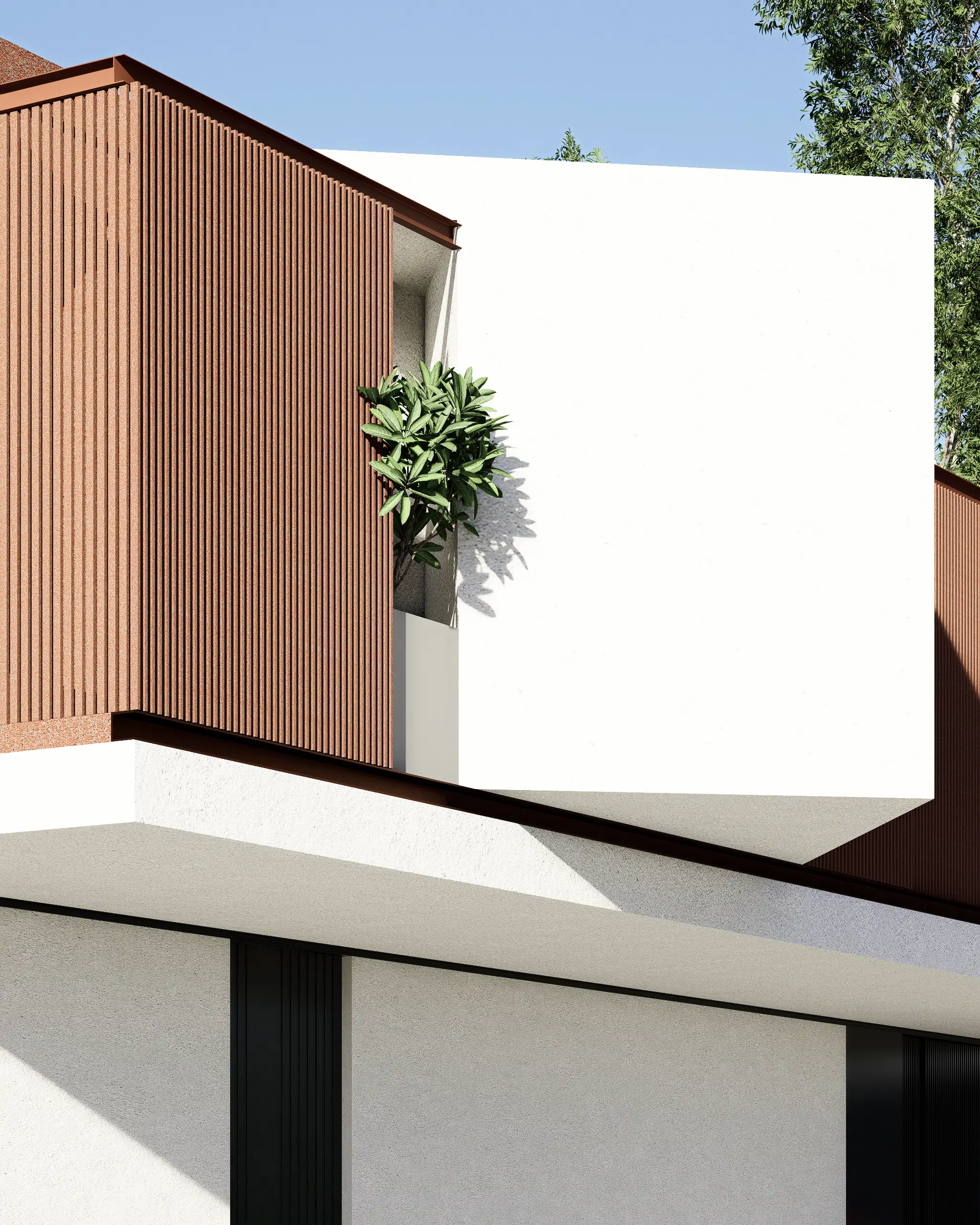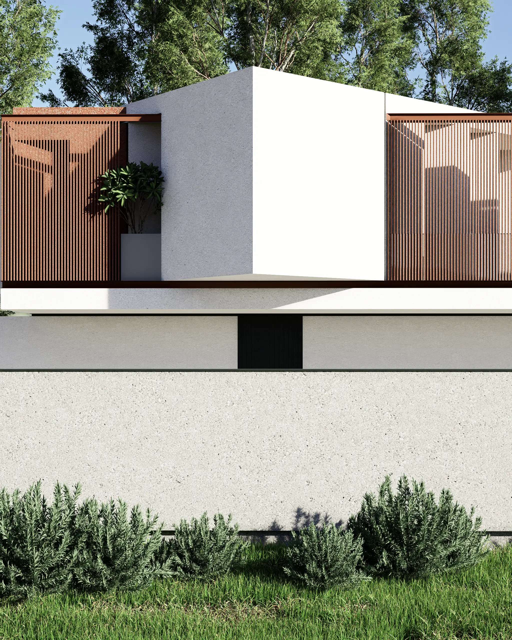 This building showcases a contemporary design with a focus on simplicity and functionality, incorporating a thoughtful selection of materials. The exposed concrete on the ground floor adds structural durability and a subtle industrial aesthetic. White walls create a clean and cohesive visual contrast, enhancing the overall brightness of the façade. Translucent and clear glass panels are strategically used to allow ample natural light while ensuring a balanced level of privacy.The spacious terrace, enriched with green landscaping, serves as a functional and tranquil outdoor area, blending natural elements with modern architectural principles. The design avoids unnecessary complexity, emphasizing minimalism, spatial efficiency, and a harmonious balance between materials and textures.